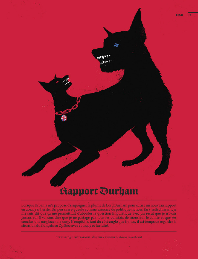 illustrations que j'ai fait pour Urbania spécial Anglos. Biz, l'auteur de l'article, a revisité le Rapport Durham, datant du 19e siècle, qui recommandait l'assimilation rapide des francophone du Québec par les colonies britanniques.
