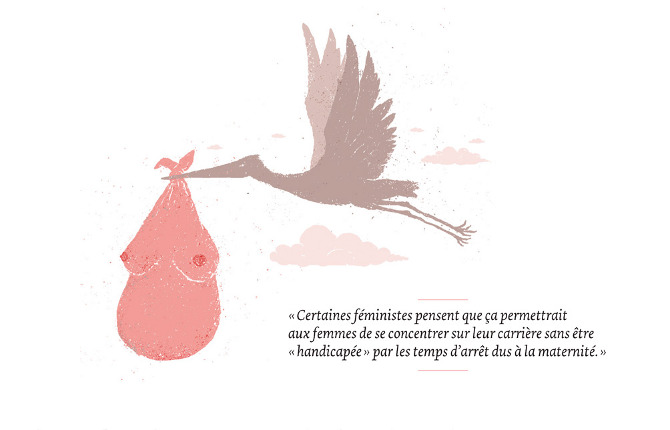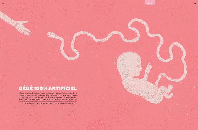 Illustrations dans l'Urbania spécial Bébé pour l’essai sociologique de Sylvie Martin analysant la recherche sur l’utérus artificiel. Un projet ambitieux permettant de créer des bébés en laboratoire...