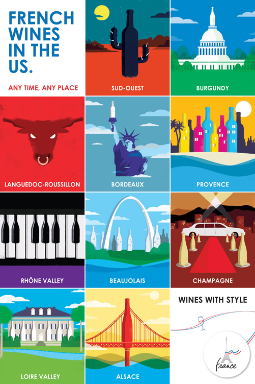 J'ai été mandaté pour créer 10 illustrations pour la campagne américaine de Vins de France. Chacune de ces illustrations représentent les caractéristiques de 10 villes américaines. / I was commissioned to create 10 illustrations for the U.S. campaign of Wines of France. Each of these illustrations depict the characteristics of 10 American cities.